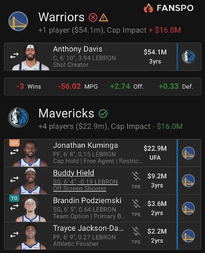 最新模拟交易方案显示,勇士可以打包送出库明加+希尔德+波杰姆斯基+TJD,从独行侠换来浓眉哥。